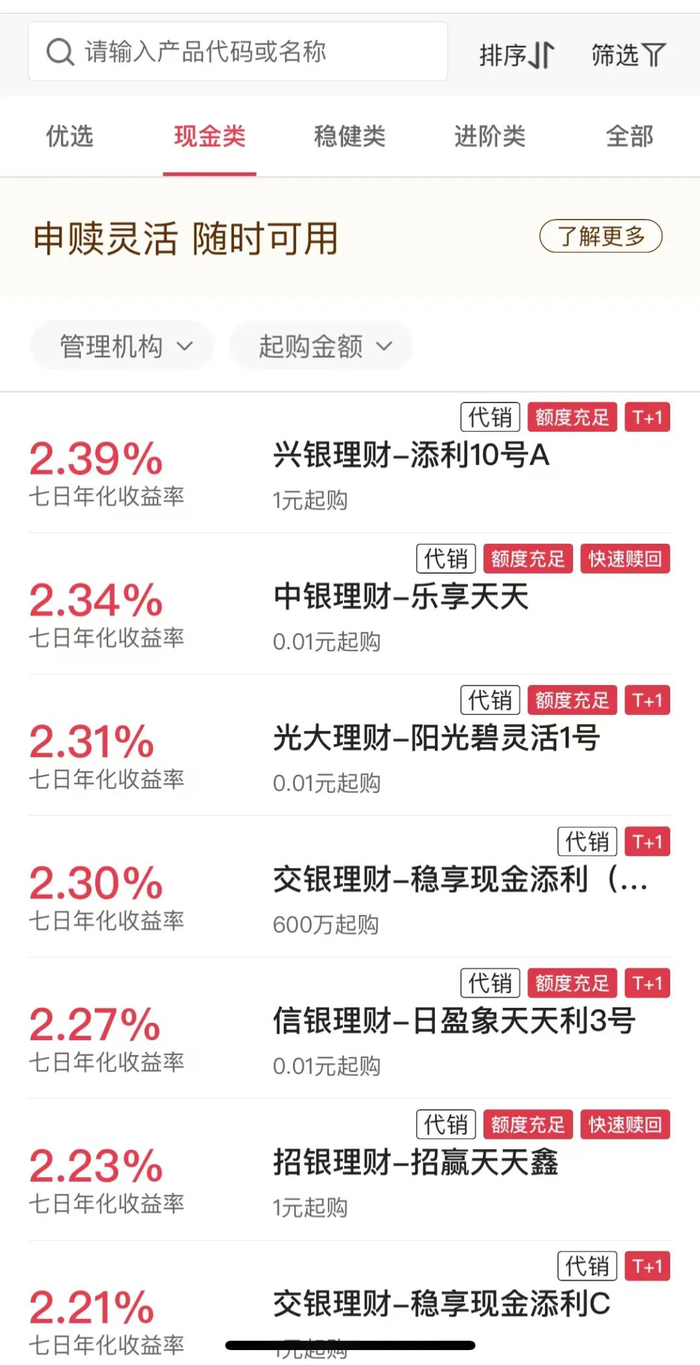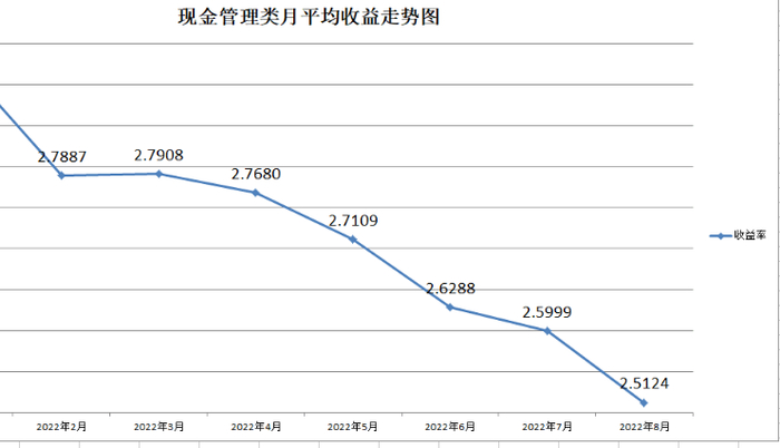从现金管理理财产品的收益率情况来看,记者注意到,该类理财产品的收益率普遍持续下滑,7日年化收益率跌破2.2%并不罕见,普遍收益率处于2.5%以下。