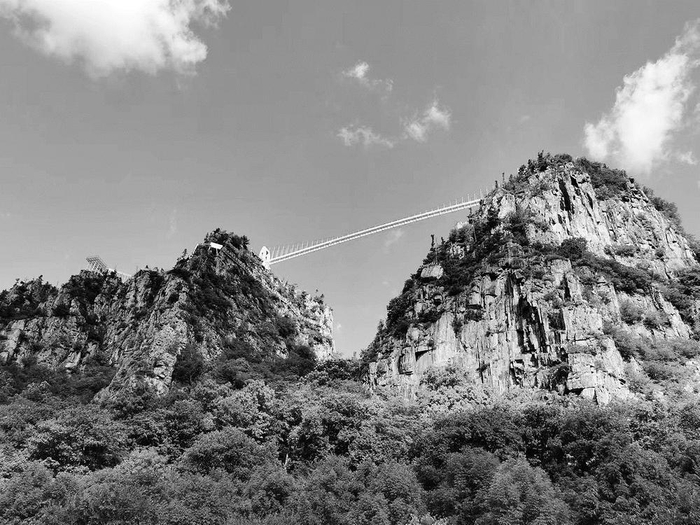 2017年8月,当地在两峰之间建设了玻璃栈道,成为黑龙江省内最长的高空玻璃鹊桥,瞬时成为网红打卡地。站在鹊桥上俯瞰,不仅可以将壮美秀色尽收眼底,还可挑战脚踏悬空,步步惊心的刺激。