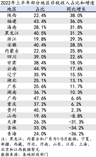 截至8月19日,已有21个省(直辖市、自治区)披露了上半年财政数据,其中,17个地区上半年非税收入同比有所增加,陕西省同比增长38.0%,为目前已知增速最快的省份,福建、海南、黑龙江三省非税收入增速也在30%以上。