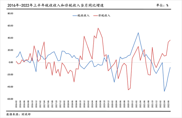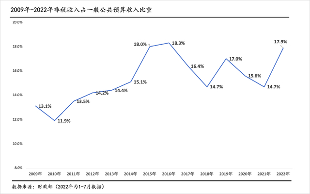 财政部数据显示,由于上半年新冠疫情的超预期影响以及实施大规模留抵退税政策,1-7月,全国一般公共预算收入同比下降9.2%。其中,税收收入下降更多,较去年同期下降13.8%,而一般公共预算收入的另一重要组成非税收入却逆势走高,同比增长19.9%,比去年同期增速高出5.2个百分点。