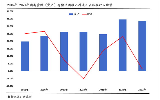 从趋势来看,国有资源(资产)有偿使用收入增长速度近年来明显放缓。2021年,该项收入仅同比增长1%,而2019年和2020年同比增速分别为14%和23%。