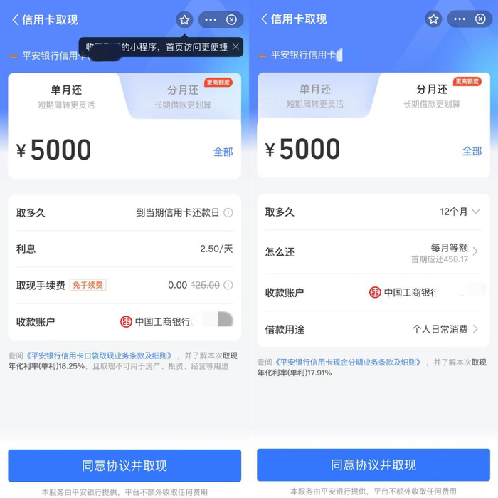 在相关协议中,提到“单月还”取现额度将计入信用卡当期账单的最低还款额;“分月还”则是按照约定的还款周期和金额,进行分期还款。而上述两项服务分别对应的是平安银行信用卡口袋取现业务、信用卡现金分期业务。