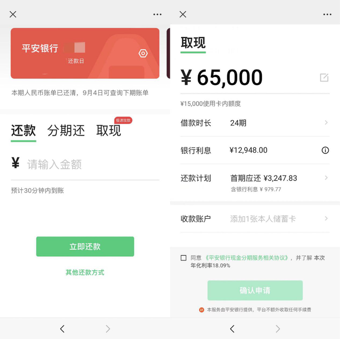 “而我今天通过微信偿还信用卡时,也注意到页面上平安银行信用卡板块增添了‘取现’字样,并且提示‘极速放款’。”王瑜向北京商报记者介绍称。