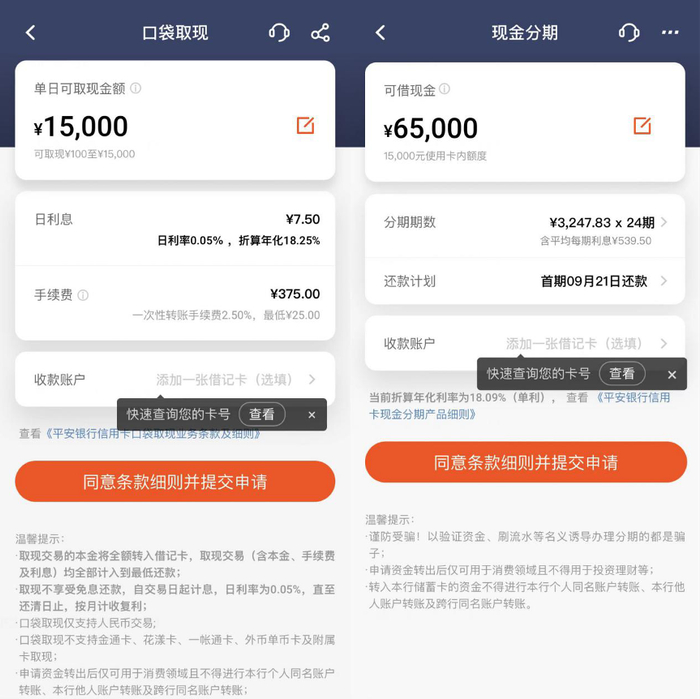 同样以平安银行为例,在其自营渠道也能找到“现金分期”和“口袋取现”的入口。在平安口袋银行App“现金分期”业务中,王瑜的额度是65000元,年化利率为18.09%。“口袋取现”额度为15000元,年化利率为18.25%,还需要额外支付2.5%的手续费。
