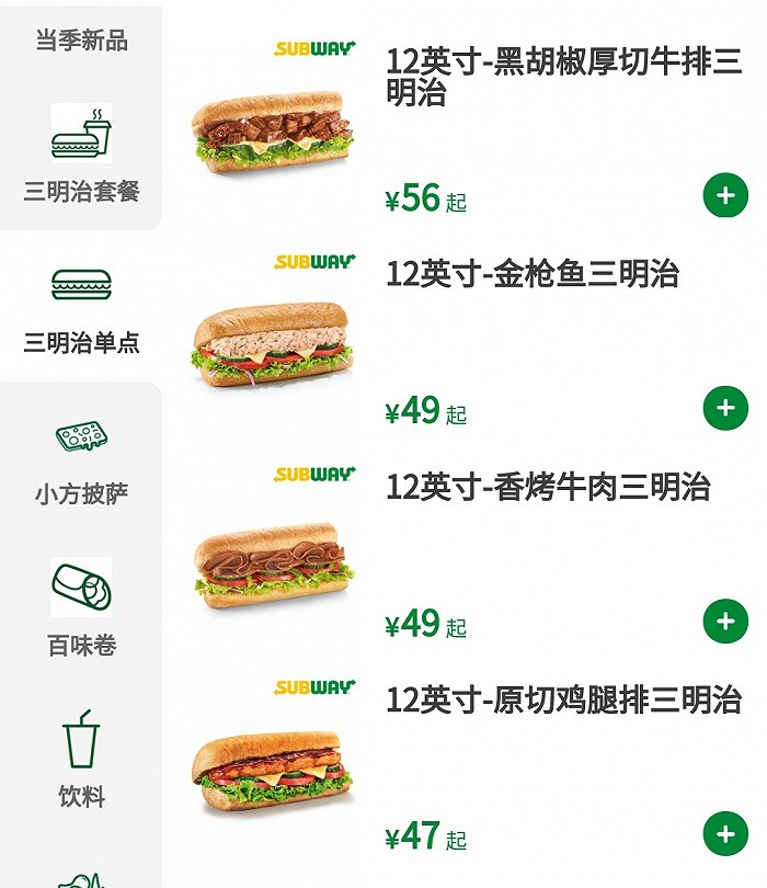 赛百味有两种尺寸的三明治,6寸三明治价格逼近30元,大多数成年男性还吃不饱。12寸三明治,又太容易让人吃撑,价格也飙升到了50元左右。