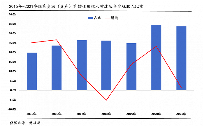 从趋势来看,国有资源(资产)有偿使用收入增长速度近年来明显放缓。2021年,该项收入仅同比增长1%,而2019年和2020年同比增速分别为14%和23%。
