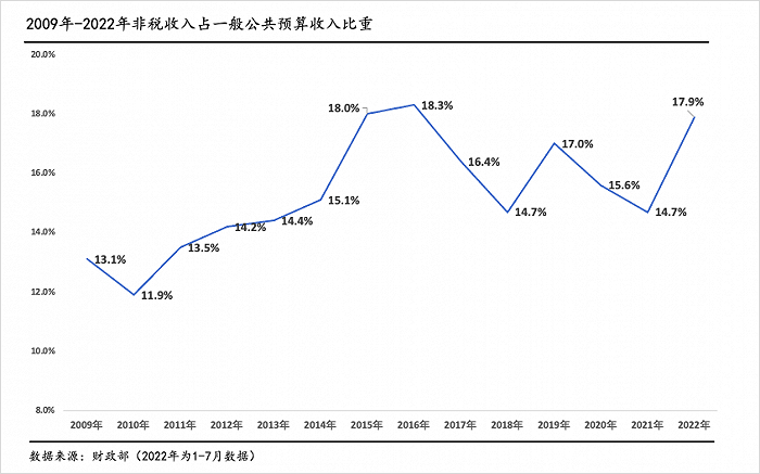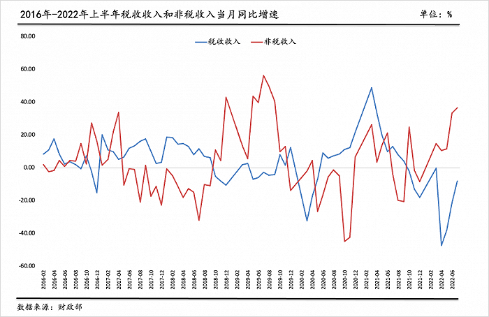 财政部数据显示,由于上半年新冠疫情的超预期影响以及实施大规模留抵退税政策,1-7月,全国一般公共预算收入同比下降9.2%。其中,税收收入下降更多,较去年同期下降13.8%,而一般公共预算收入的另一重要组成非税收入却逆势走高,同比增长19.9%,比去年同期增速高出5.2个百分点。