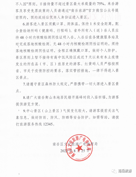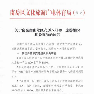 关于为维护南岳衡山景区农历八月初一(8月27日 周六)旅游秩序和公共安全,确保游客健康出游、安全出行,现将有关事项通告如下: