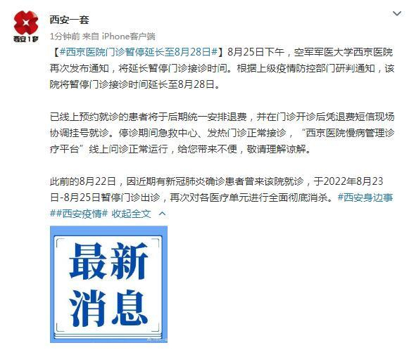 【#西京医院门诊暂停延长至8月28日#】8月25日下午,空军军医大学西京医院再次发布通知,将延长暂停门诊接诊时间。根据上级疫情防控部门研判通知,该院将暂停门诊接诊时间延长至8月28日。