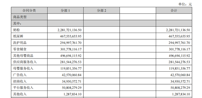 再来看一看具体的商品销售情况,据孩子王财报数据,上半年,孩子王实现营业总收入43.7亿元,其中母婴商品营收38.43亿,供应商服务收入2.815亿,母婴服务收入1.199亿,平台服务、广告收入和招商收入分别为5081万、4257万、3493万。