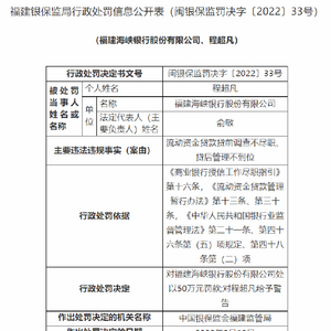 8月25日消息,据中国银保监会福建银保监局行政处罚信息公开表显示,福建海峡银行股份有限公司因存在流动资金贷款贷前调查不尽职、贷后管理不到位的行为,被处以50万元罚款;该行程超凡被处以警告。