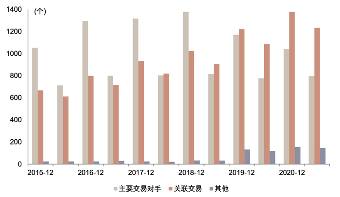 供应链数据的来源大多为主要交易对手和关联交易。我们筛选客户和供应商均为A股上市公司的股票,并对供应链关系的来源进行统计。由于部分供应链关系有多种来源,因此本文将统计A股公司供应链关系的主要来源,根据主要交易对手>关联交易>其他的重要程度进行筛选。由下图可知,供应链数据大多为主要交易对手信息披露和关联交易披露,且近期关联交易的供应链数据量有所上升。