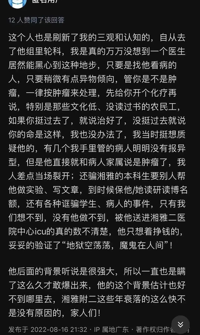此前有知乎网友发文举报,湘雅二医院刘翔峰存在严重的医疗作风问题。比如,找他看病,只要稍微有点异物倾向,不管是不是肿瘤,一律按肿瘤处理,先做化疗。再比如,机器人做不完全性肠梗阻,开进去找不到梗阻段,就把正常肠管切下来给家属看。