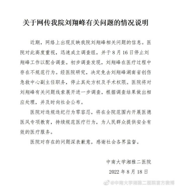 8月18日,@中南大学湘雅二医院官方微博 发布情况说明,初步调查发现,刘翔峰在医疗过程中存在不规范行为。经医院研究,决定免去刘翔峰湖南省创伤急救中心副主任职务,停止其处方权及手术权限。医院将对刘翔峰有关问题线索展开进一步调查,根据调查结果做出相应处理,并及时向社会公布。