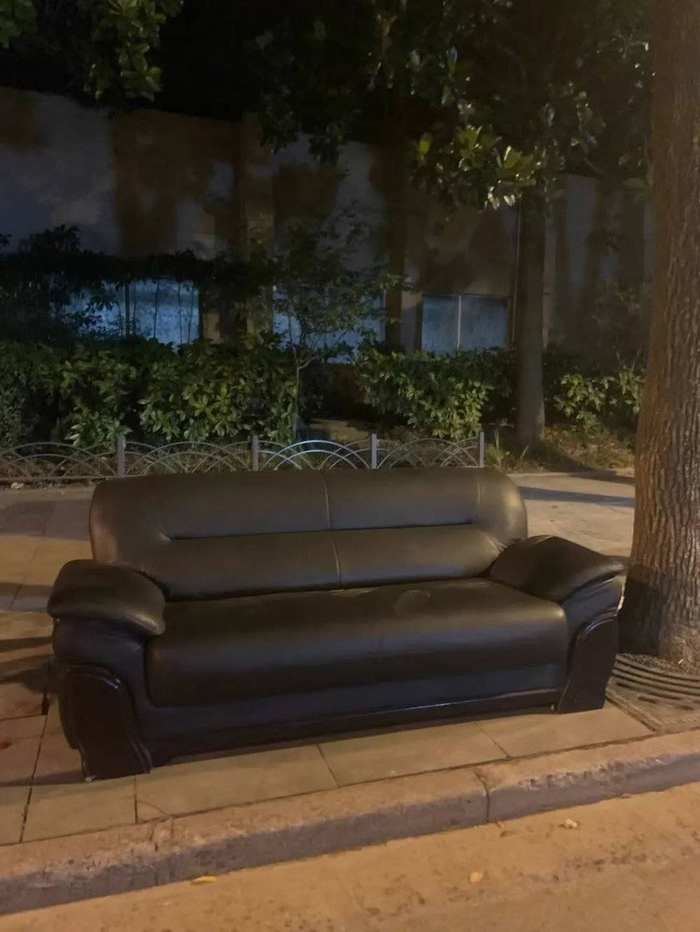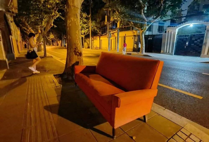 有趣的是,波妞发现大多数人会把家具搬到树下,“好像有种道德感在里面,既要偷偷丢垃圾,又想丢到尽量不碍事的地方。”像是这个城市别扭的体面感,沙发倚着梧桐树,安静地对着马路。要是波妞看到了,就会给沙发贴上一对圆溜溜的大眼睛。