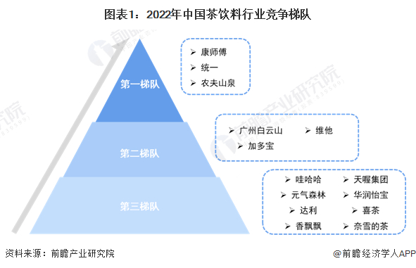 中国茶饮料行业企业大致分为三个梯队。第一梯队的企业是以康师傅、统一、农夫山泉为代表的茶饮料行业领先企业,这些企业布局多种类型茶饮料品牌及产品,在中国市场占有率相对较高;第二梯队是国内销量较高的饮料品牌,包括广州白云山、加多宝、维他等;第三梯队是从事茶饮料制造的著名品牌企业,包括哇哈哈、元气森林、天喔、华润怡宝、香飘飘等,更有以现制茶出圈布局瓶装茶饮料赛道的喜茶和奈雪的茶。
