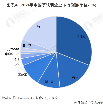 从茶饮料行业市场集中度来看,据Euromonitor统计,近年来收入排行较前茶饮料企业有康师傅、统一、广州白云山和加多宝,2018-2021年中国茶饮料企业在集中度情况逐年上涨,2021年这四家企业集中度占比为49%。