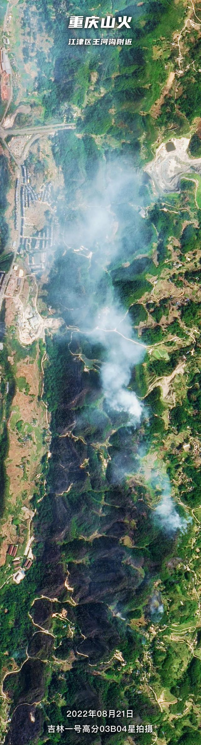 2022年8月19日下午,重庆市江津区突发森林火灾。吉林一号卫星于21日和22日分别在江津区发现多处火点正在燃烧。