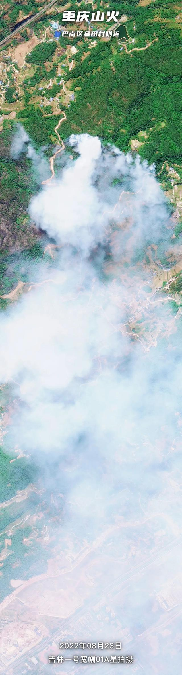 8月23日,卫星在巴南区金田村附近也发现了大范围山火燃烧痕迹。山火现场为山地,地势陡峭、风力大,扑救难度大。