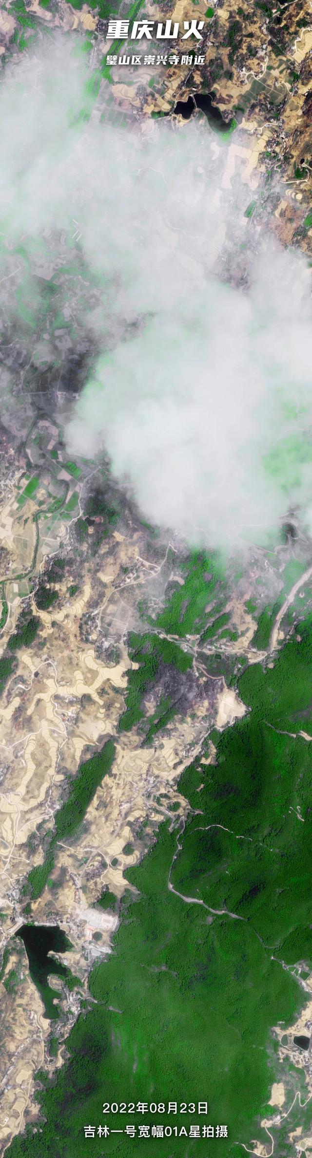 北碚区与璧山区交界火场位于璧山区崇兴寺附近,从吉林一号卫星于8月23日拍摄的该区域卫星影像来看,山火还在持续。滚滚浓烟笼罩在田野和山林之间。