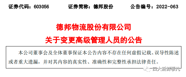 2022年8月24日,德邦股份发布公告,宣布汤先保因工作职责调整辞去财务负责人职务,继续担任德邦副总经理,聘任丁永晟为财务负责人、副总经理。值得注意的是,丁永晟曾任职于京东集团,历任财务报告团队负责人、财务部负责人等职务。