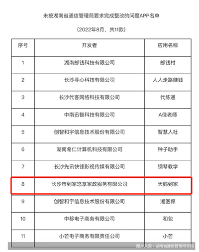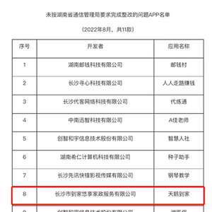 中国网科技8月26日讯(记者 沈成 见习记者 杨晓晨)近日,湖南省通信管理局公开通报11款未按期完成整改APP名单,由长沙市到家悠享家政服务有限公司开发的“天鹅到家APP”位列其中。