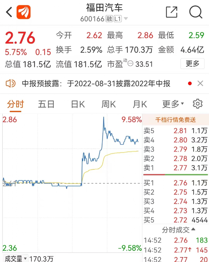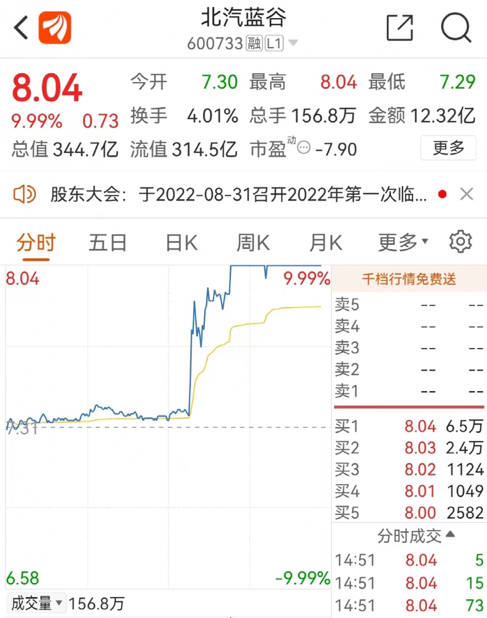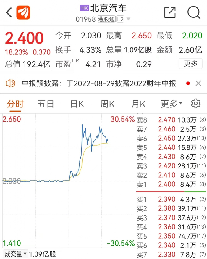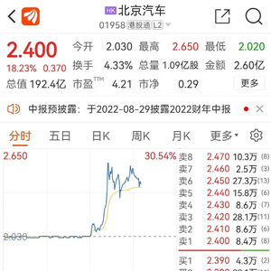 8月26日午后,市场传出消息称小米正在与北汽集团商谈制造电动汽车事宜。该消息引起北汽集团旗下多家上市公司股价异动,小米集团(1810.HK)短线拉升涨超2%,其中港股北京汽车(1958.HK)一度大涨近30%,北汽蓝谷(600733)直接封板涨停,而福田汽车(600166)也一度涨逾9%。