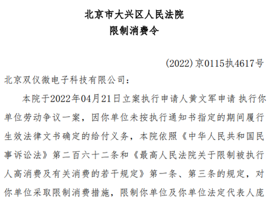 比如2022年5月11日,北京市大兴区人民法院对双仪微电子限制消费。原因是该院于2022年4月21日立案执行申请人黄文军申请执行双仪微电子劳动争议一案,但双仪微电子未按执行通知书指定的期间履行生效法律文书确定的给付义务。