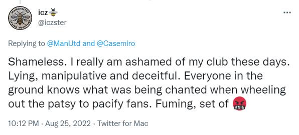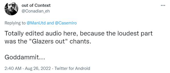 25日,曼联官方发布了相关视频,但有球迷发现俱乐部把“我们想让格雷泽退出”的声音替换成了“曼联,曼联!”这让球迷们更加不爽了。