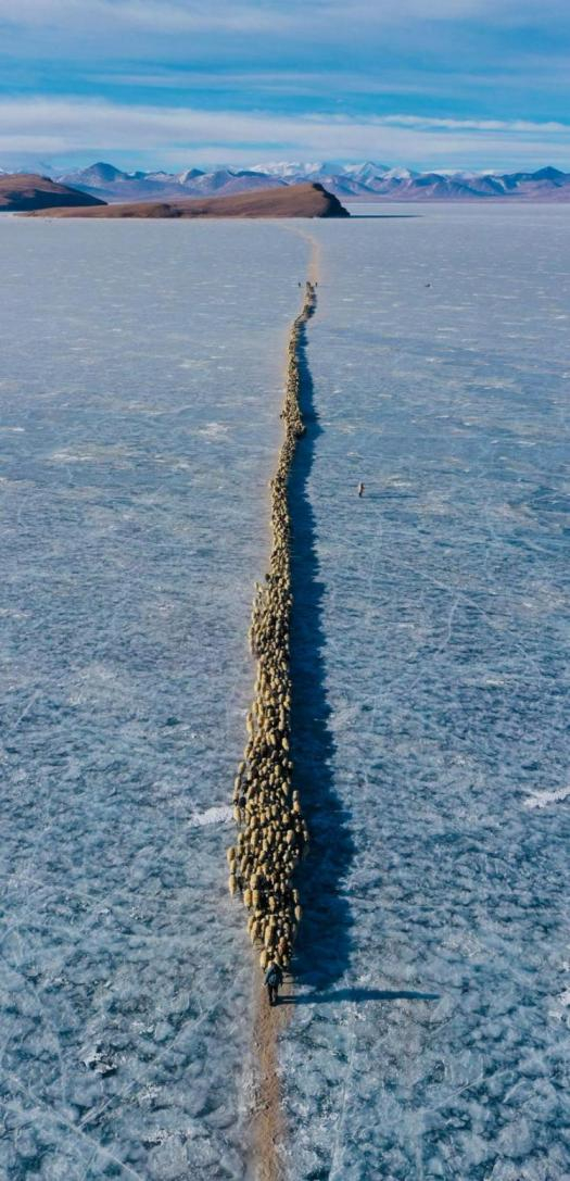 “单幅类最佳”作品《冰上转场》拍摄于3月初的西藏,描绘了当地牧民赶羊群的场景。“组图类最佳”作品《航拍数字武汉》则是创作者彭彪在2021年的一次航拍中,无意间注意到武汉某座体育馆很像数字0,从此开始在城市中寻找像数字一样的建筑。