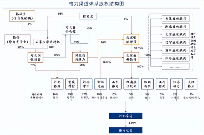 不仅如此,格力电器的第三大股东河北京海互联,成立于2006年。京海互联的股东是格力电器10家区域经销商,而在京海互联里,徐自发家族持有的股份比例最高,是第一大股东,持股高达28%。