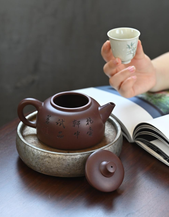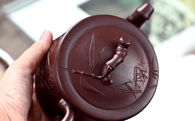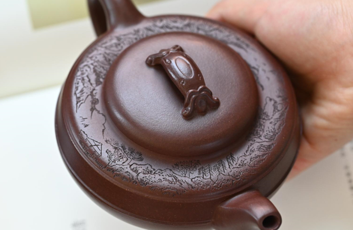 它鼓盖的设计,与壶身严丝合缝地对接在一起,贴花+琢刻效果也是1+1﹥2。