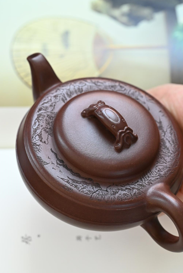 最考究的还属壶肩部的“刹凹工艺”,懂壶的都知道,越扁的壶成型越难,也非常考验匠人的工艺。肩部一圈更刻有远山、飞鸟、人家,意境天成...
