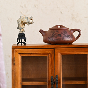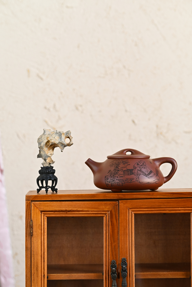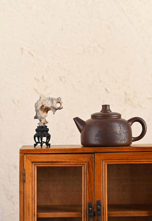 壶的正面篆刻花瓶雅竹和太湖石,壶的侧面篆刻潇洒飘逸的行书文字,整体画面极具文人气,仿若置身于江南水城中,欣赏独特清幽的山水美景。