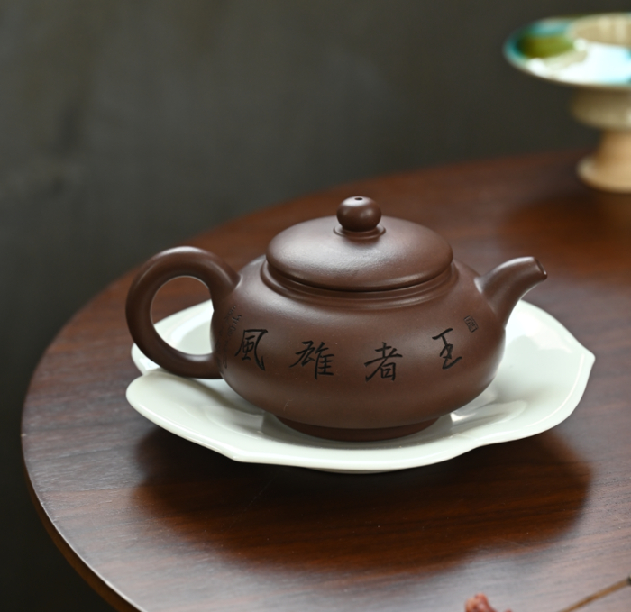 行书配文“一花一世界,一叶一菩提”,享用这把壶让茶人饮茶时瞬间有种清心静气的体验,对于喜爱佛学或追求闲适品茗的茶友,这把壶绝对是首选。