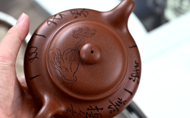 壶盖上呈现佛手持莲花的造型,端庄不失禅心。