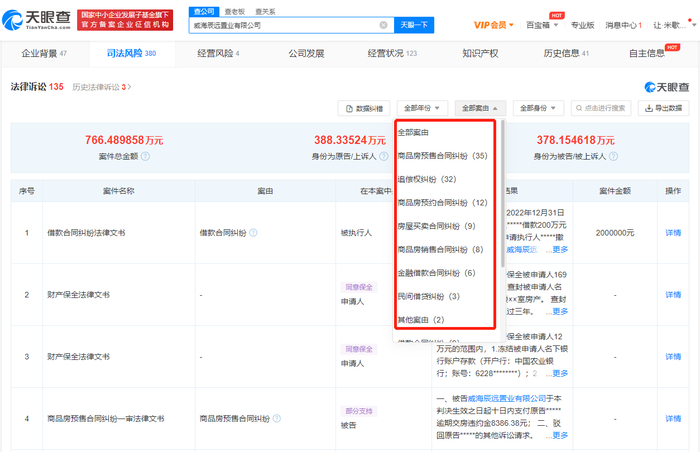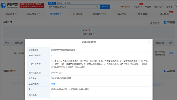 风险信息显示,该公司涉及多起商品房预售合同纠纷、追偿权纠纷等。此外,2021年3月,该公司曾因非法占用土地,被乳山市综合行政执法局罚款2.5万余元。