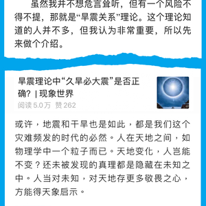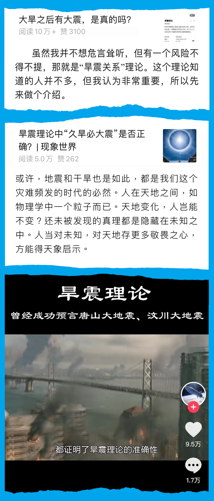 其中最离谱的、恐吓架势最足的,是警告大家“大旱之后有大震”的“旱震理论”。不少人信以为真,相关内容被大量转发。