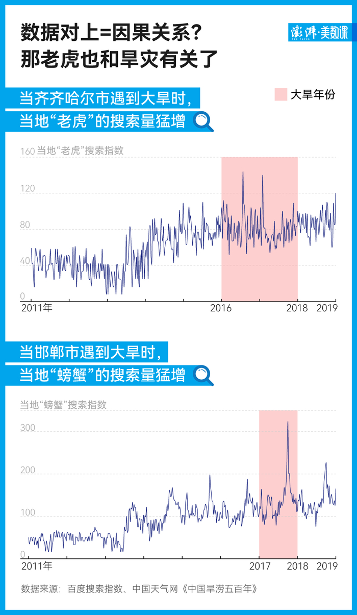 举一个极端的例子:齐齐哈尔发生旱灾的那几年,当地人上网搜“老虎”的频次异常高。按照“旱震理论”的逻辑,这里或许隐藏着一个“大旱老虎理论”:大旱发生之后,齐齐哈尔人就会陷入对老虎的痴迷之中。