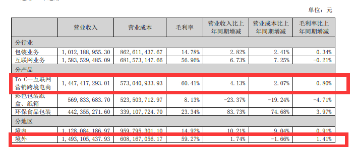 从毛利率方面来看,吉宏股份跨境电商渠道的毛利率高达60%,在所有分类中稳居第一。