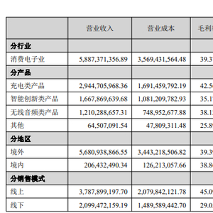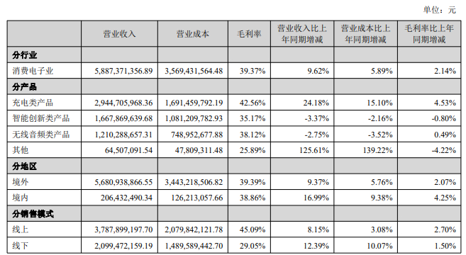 无线音频品类以 soundcore(声阔)系列产品为主,实现收入 12.10 亿元,受新品推出周期和市场需求影响,营收同比下降2.75%,占总营收的 20.56%。