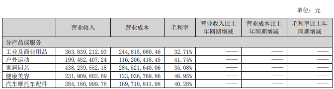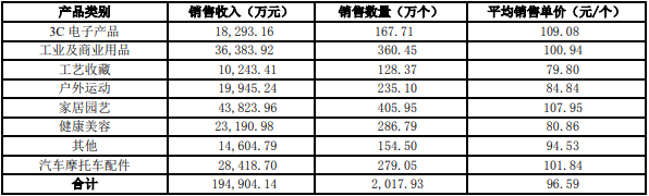 易佰网络的主要经营品类是家居园艺、健康美容、汽车摩托车配件、工业及商业用品等,其中家居园艺和工业及商业用品的销售收入更高一些,分别为4.3亿和3.6亿。