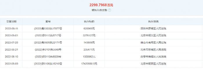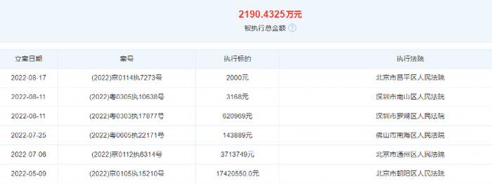 截至目前,北京寺库开庭公告高达313件,法律诉讼292件,案件总额超1300万元。5月9日,北京寺库新增被执行人信息,执行标的1742万余元,执行法院为北京市朝阳区人民法院,目前该公司被执行总金额为2190万余元。