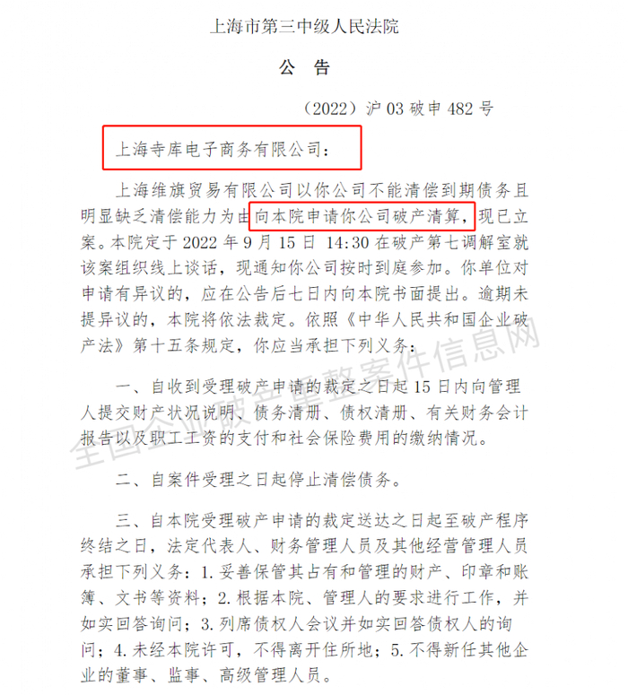 全国企业破产重整案件信息网公示的(2022)沪03破申482号信息显示,上海维旗贸易有限公司以上海寺库不能清偿到期债务且明显缺乏清偿能力为由向法院申请该公司破产清算,现已立案。上海市第三中级人民法院定于9月15日14:30组织线上谈话。