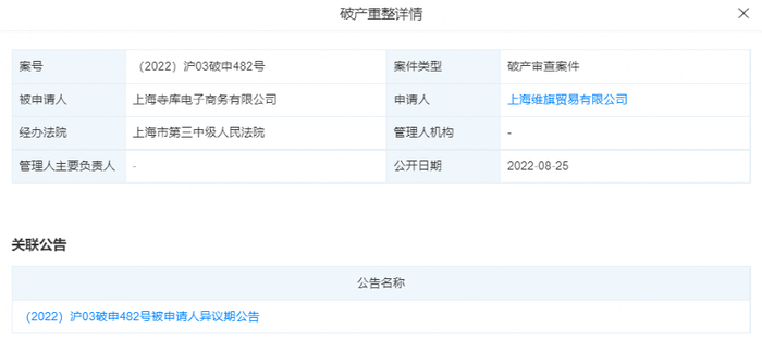 8月25日,上海寺库电子商务有限公司新增一则破产审查案件,申请人为上海维旗贸易有限公司,经办法院为上海市第三中级人民法院。