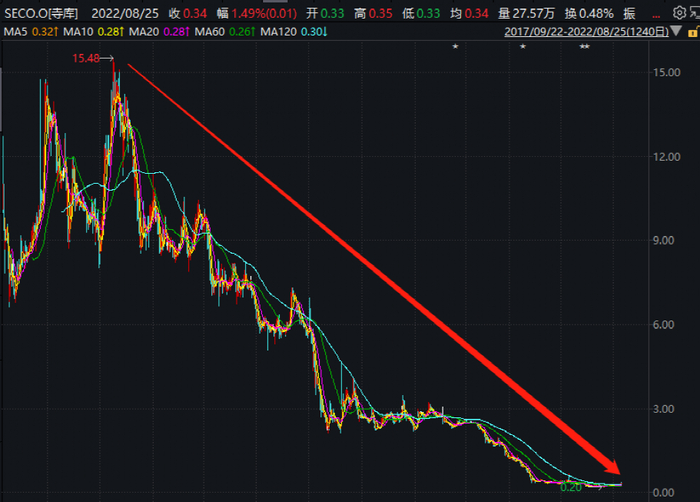 上市后,该股股价曾一度冲高至15.48美元/股,但随后便开启“跌跌不休”的状态,股价逐渐走低。截至目前,寺库集团报0.34美元/股,较历史高点已经跌近98%,当前总市值2402万美元。