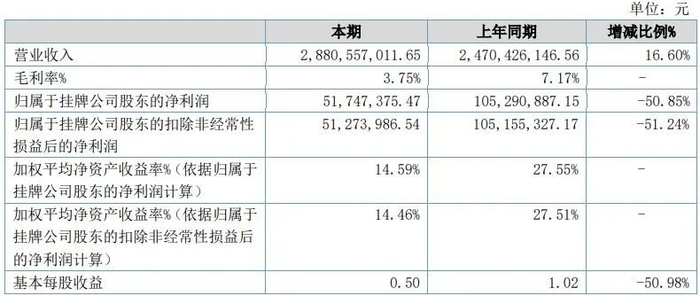 据华士食品2022年半年度报告,报告期内公司实现营业收入2,880,557,011.65元,同比增加16.60%;归属于挂牌公司股东的净利润51,747,375.47元,同比减少50.85%。
