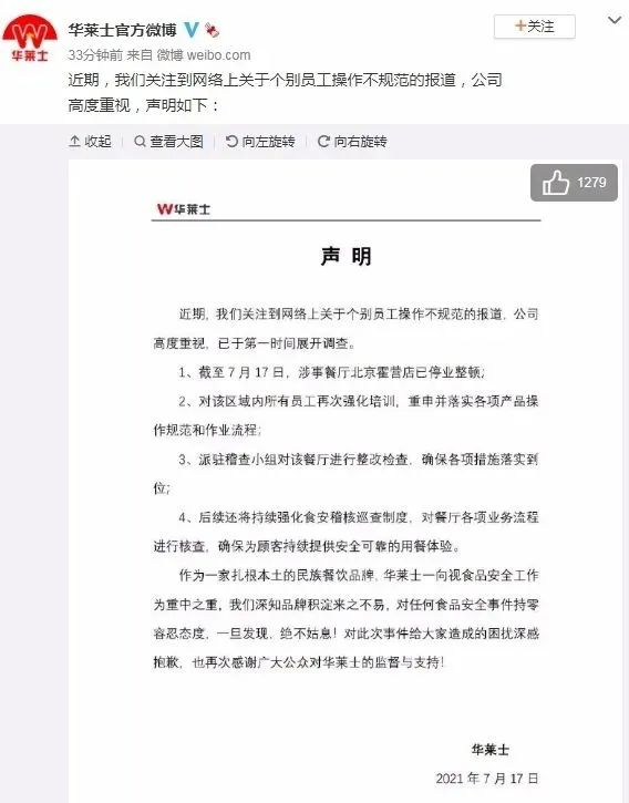 当时,华莱士回应称,涉事餐厅北京霍营店已停业整顿,派驻稽查小组对该餐厅进行整改检查,同时对该区域内所有员工再次强化培训,重申并落实各项产品操作规范和作业流程。华莱士表示,对此次事件给事件给大家造成的困扰深表抱歉。
