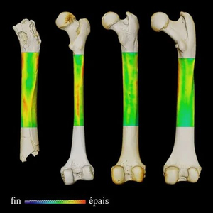 从左到右依次是乍得沙赫人、现存人类、黑猩猩和大猩猩的股骨3D皮质厚度变化图(后视图)。图片来源:Franck Guy