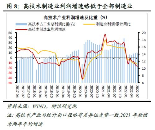 四是高技术制造业利润继续放缓,但新旧动能转换趋势未变。根据我们的统计,1-7月份高技术制造业利润同比降幅继续有所扩大,且增速仍低于同期全部制造业(见图8),主因受高基数效应影响,高技术制造业中利润占比约3-4成的医药制造业利润回落较多(1-7月份同比下降30.7%)。但国内新旧动能转换的大趋势未变,从利润占比看,2022年1-7月份高技术制造业利润占规模以上工业利润的比重,较1-6月份提高0.1个百分点,较2019年同期仍高0.8个百分点。